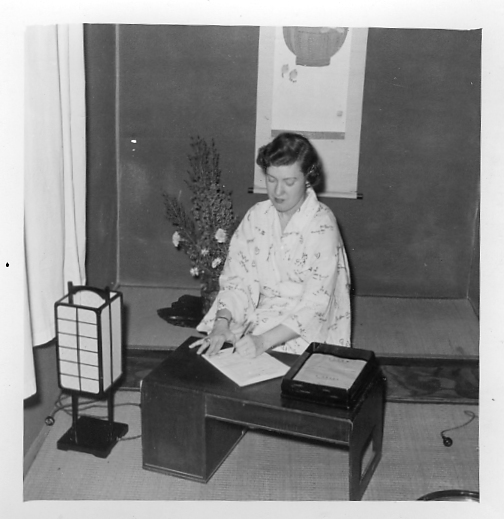 Desc=Klein wearing kimono and writing on low Japanese table