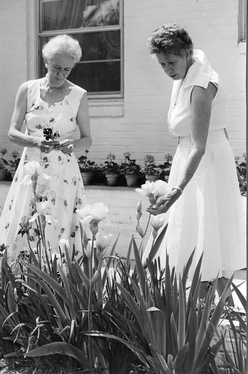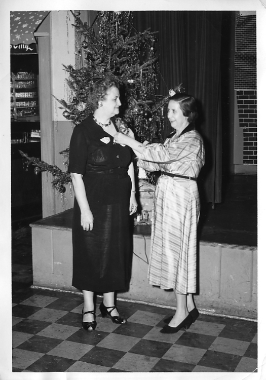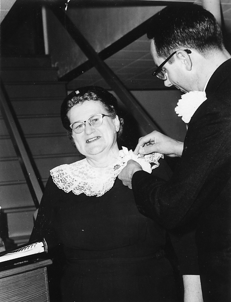Desc=ma pinning corsage on lady; Myers